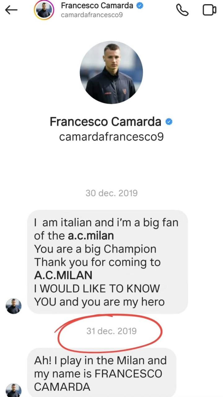截图里,卡马尔达在2019年12月通过社交平台向伊布倾诉心声:“我是意大利人,也是AC米兰的铁杆粉丝。你是我心中的英雄,感谢你为AC米兰带来的荣耀。我渴望与你相识,因为你是我梦想的灯塔。”